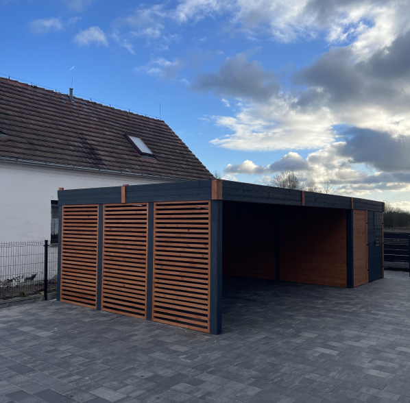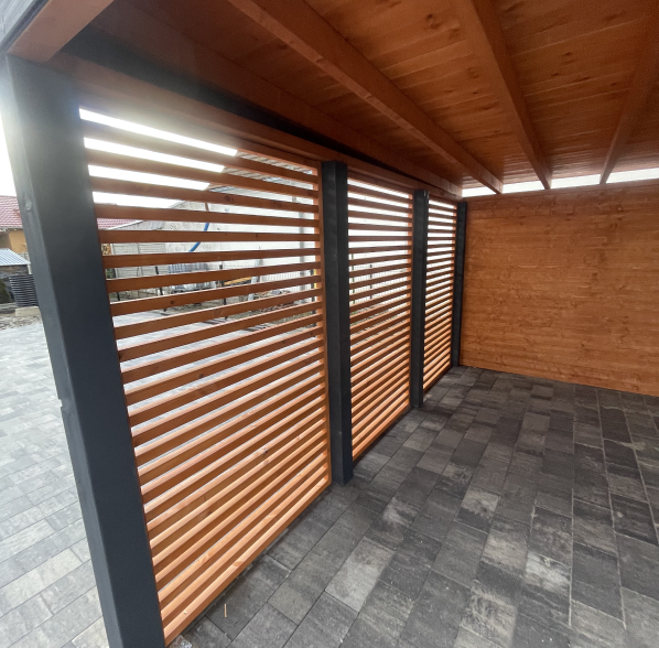 Otwarta część pozwala na wygodne parkowanie, a zamykane pomieszczenie gospodarcze sprawdzi się jako schowek na narzędzia, sprzęt ogrodowy lub rowery. Solidne drewno i staranne wykonanie gwarantują stabilność i długowieczność konstrukcji.